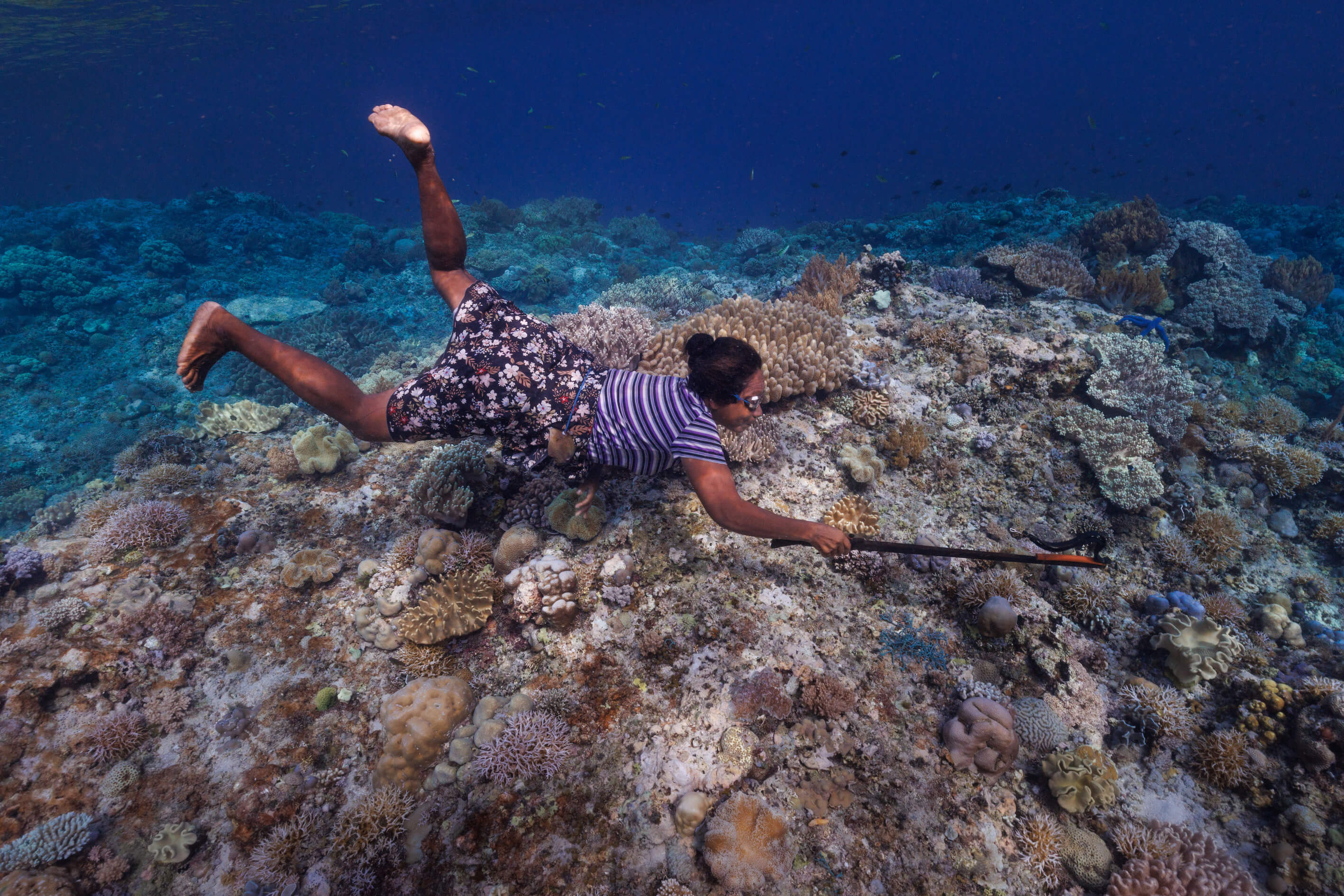 “The Wawata Topu are highly efficient fishers and they are incredibly successful,” she begins. “Even in the shallow water, they can catch octopus, reef fish, and I saw them multiple fish per dive, threading them onto these strings they tie around their waists.