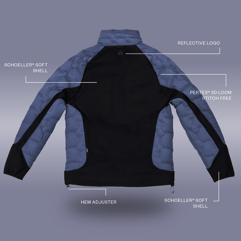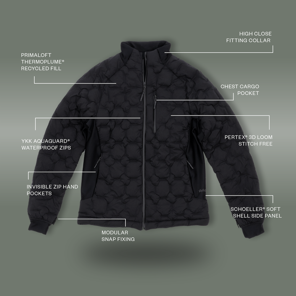 A stitchless baffle thermal jacket crafted from Pertex® 3D Loom fabric and filled with PrimaLoft® ThermoPlume recycled loose fibres. The seamless construction enhances durability and wind resistance, while providing down-like warmth with fast-drying performance.