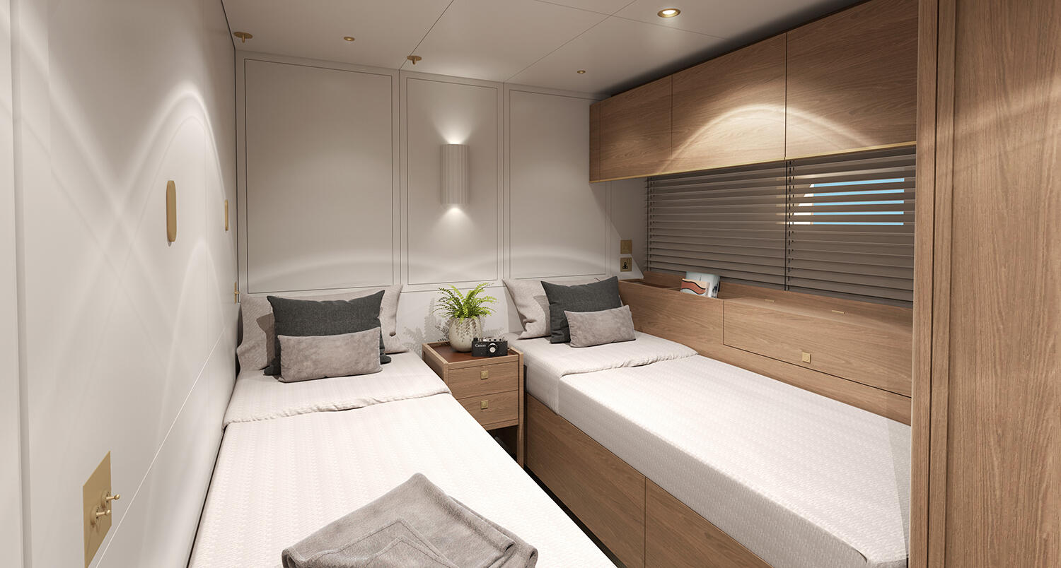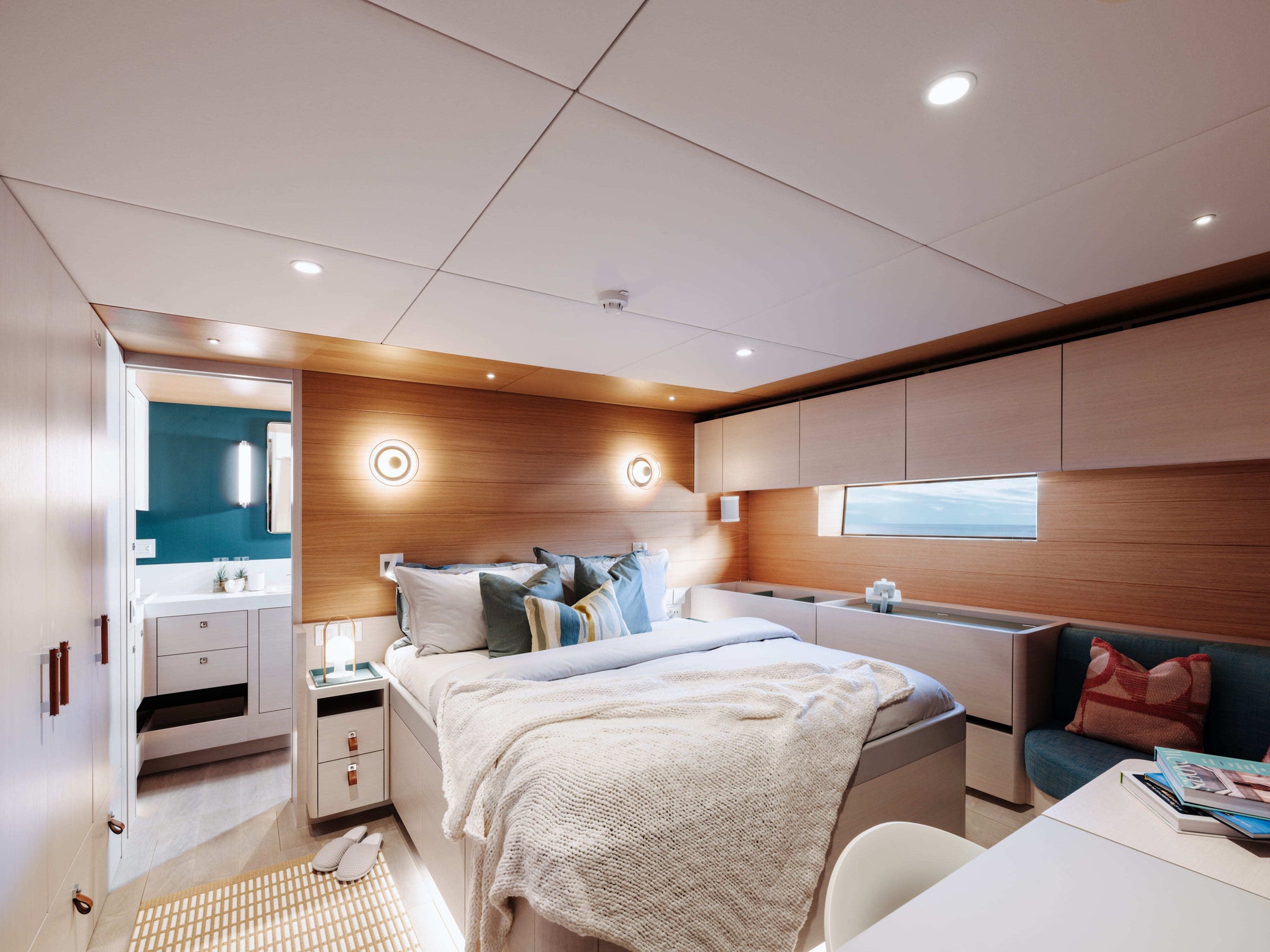 The sanctuary below offers sizeable en-suite cabins and a cosy snug or office room that can be arranged to suit. Natural light fills the area through sizeable portlights, creating a luxurious and relaxing space to rest and unwind.