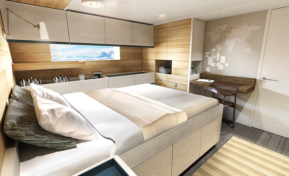 When at sea the interiors need to be functional, welcoming but also varied in design. As the vessels are built for long expeditions giving each cabin a unique character is key.ARKSEN DESIGN TEAM