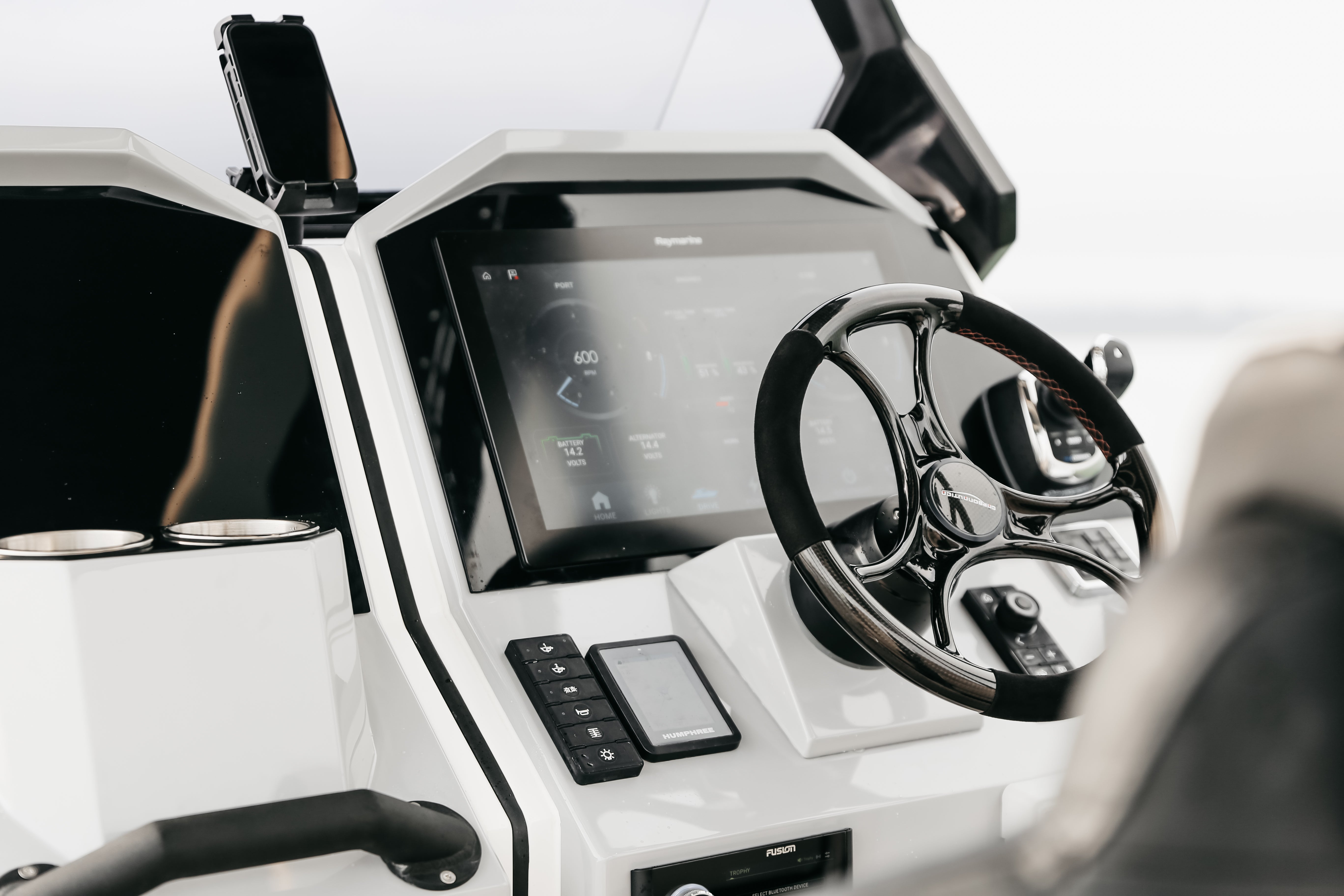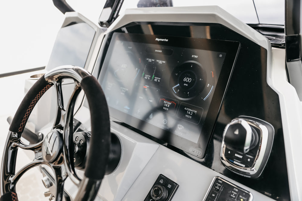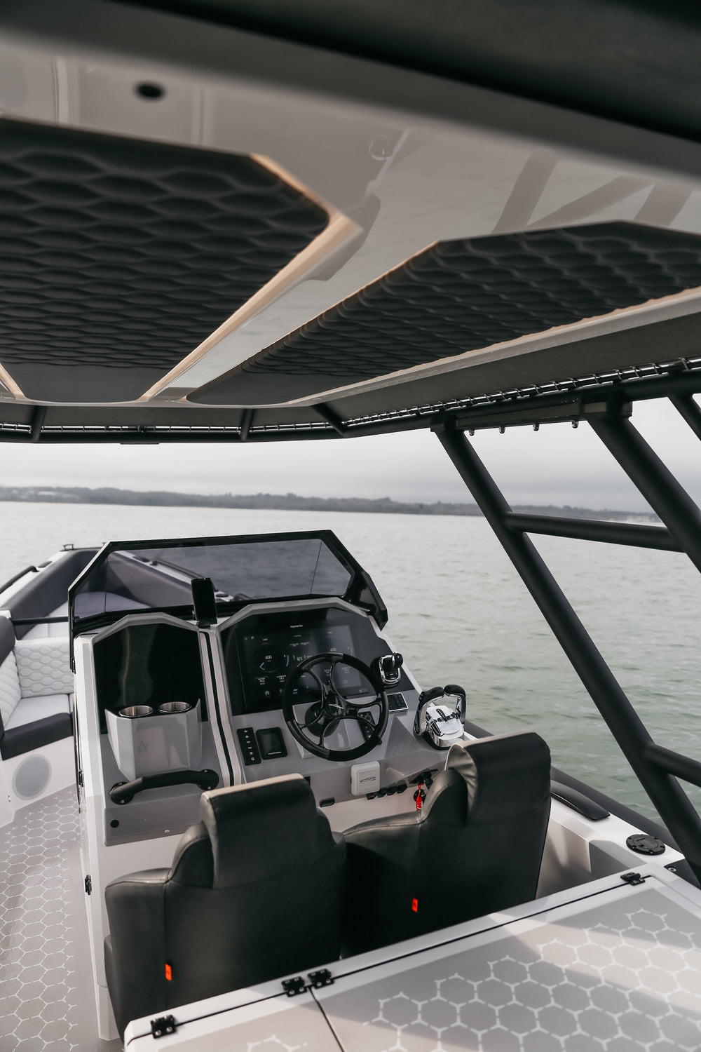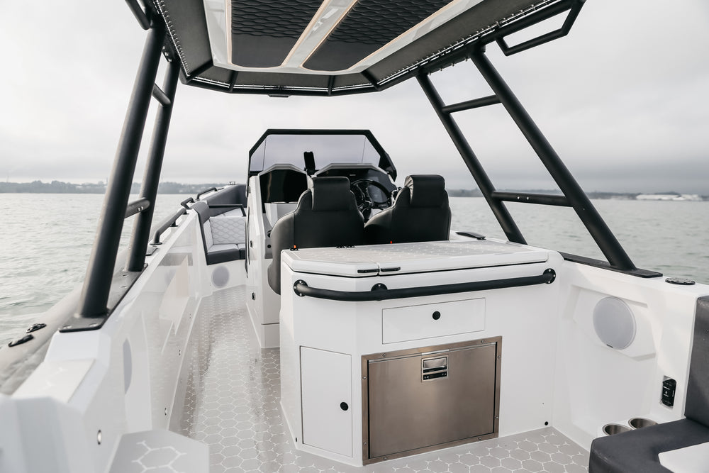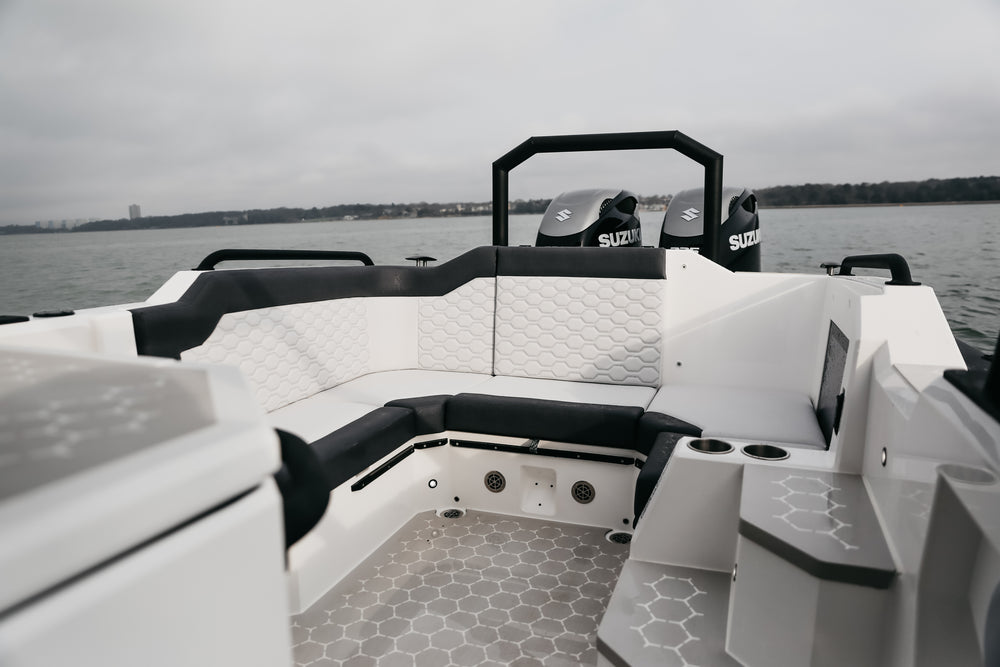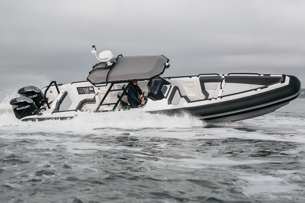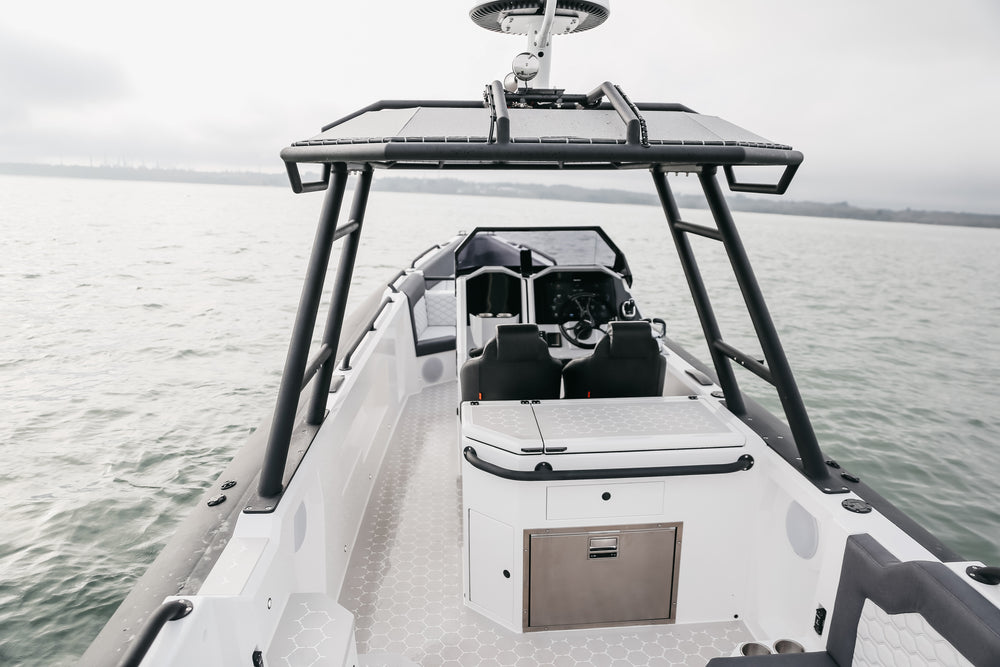 The 10 has striking aesthetics inside and out, combining a two tone light grey topside and white hull with heavy-duty D-Section Black Carbon ORCA 866 Hypalon tubes and custom Esthec marine decking with a hexagonal motif that features throughout the boat. Flexible seating options include a sun bed and bench seat forward, a nook at the front of the console, and a large u-shaped relaxation space aft with stowable table and option to convert this area into an additional sun bed.