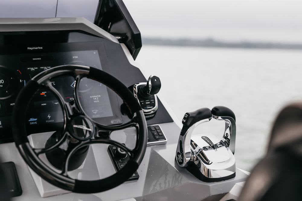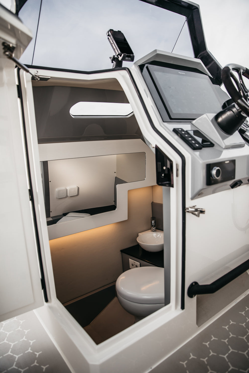- Large console offset to starboard housing a spacious WC