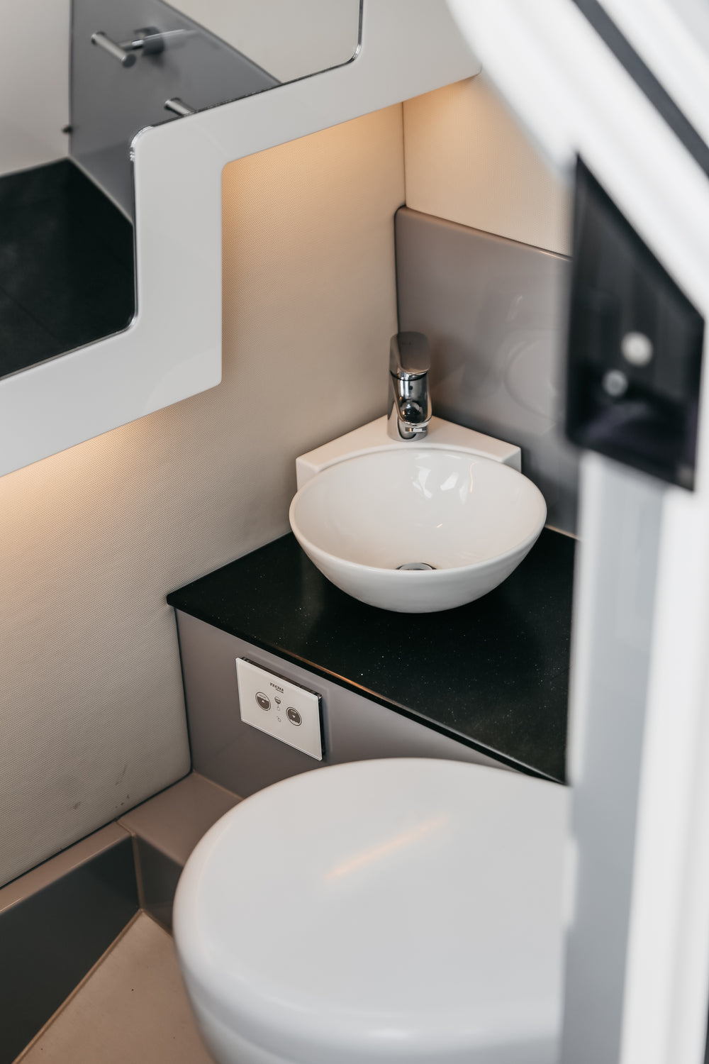 Luxuriously appointed WC compartment housed in the console pod, with freshwater sink and freshwater flush toilet with holding tank.