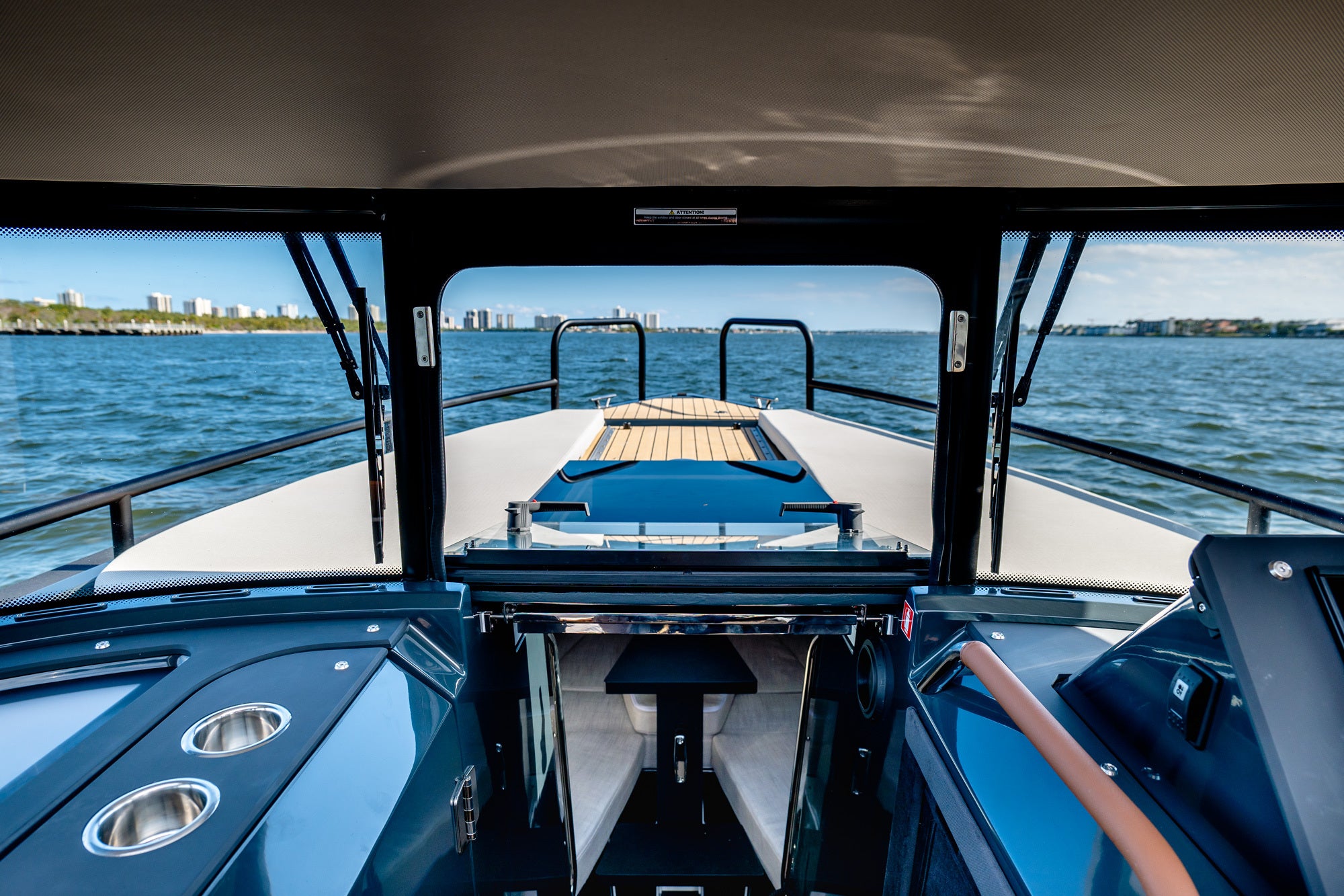 The main cabin is stylishly trimmed with leather and Italian fabrics and brings the outside in with its deep windows and glass sunroof roof that can be opened to let the sun in or let you enjoy the stars. With doors and windows closed, the pilothouse is totally watertight. The custom helm seat boasts suspension to smooth out any bumps and the bolster adjusts to allow supported standing or sitting positions.