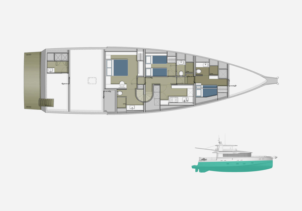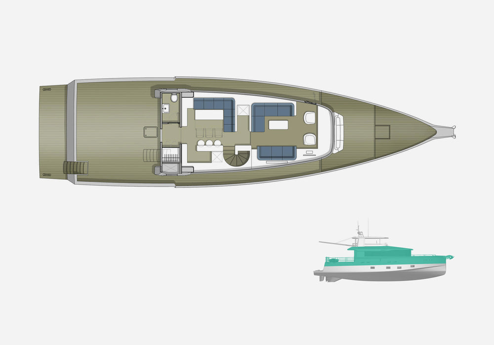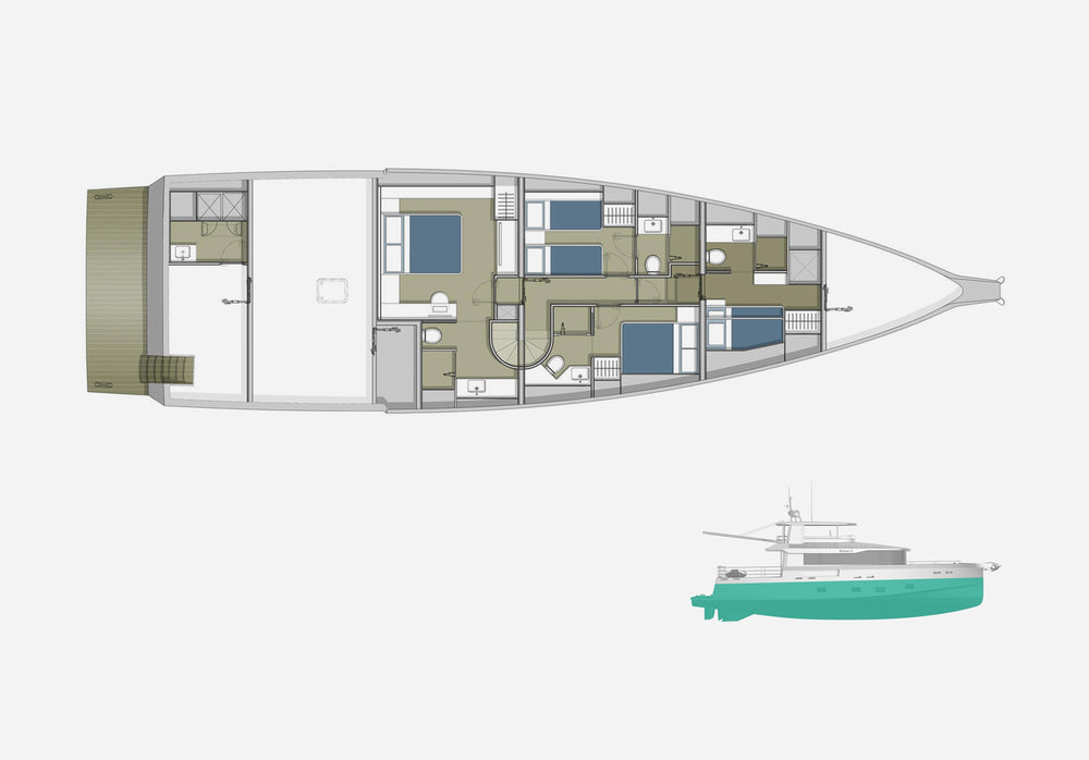 The open upper deck is a perfect vantage point for whale-watching or bird-spotting under way or at anchor. On the main deck, there’s a good deal of outside space aft, as well as an open seating area forward, perfect for star-gazing at night. For the divers and paddlers, the swim platform gets you in direct touch with the ocean.