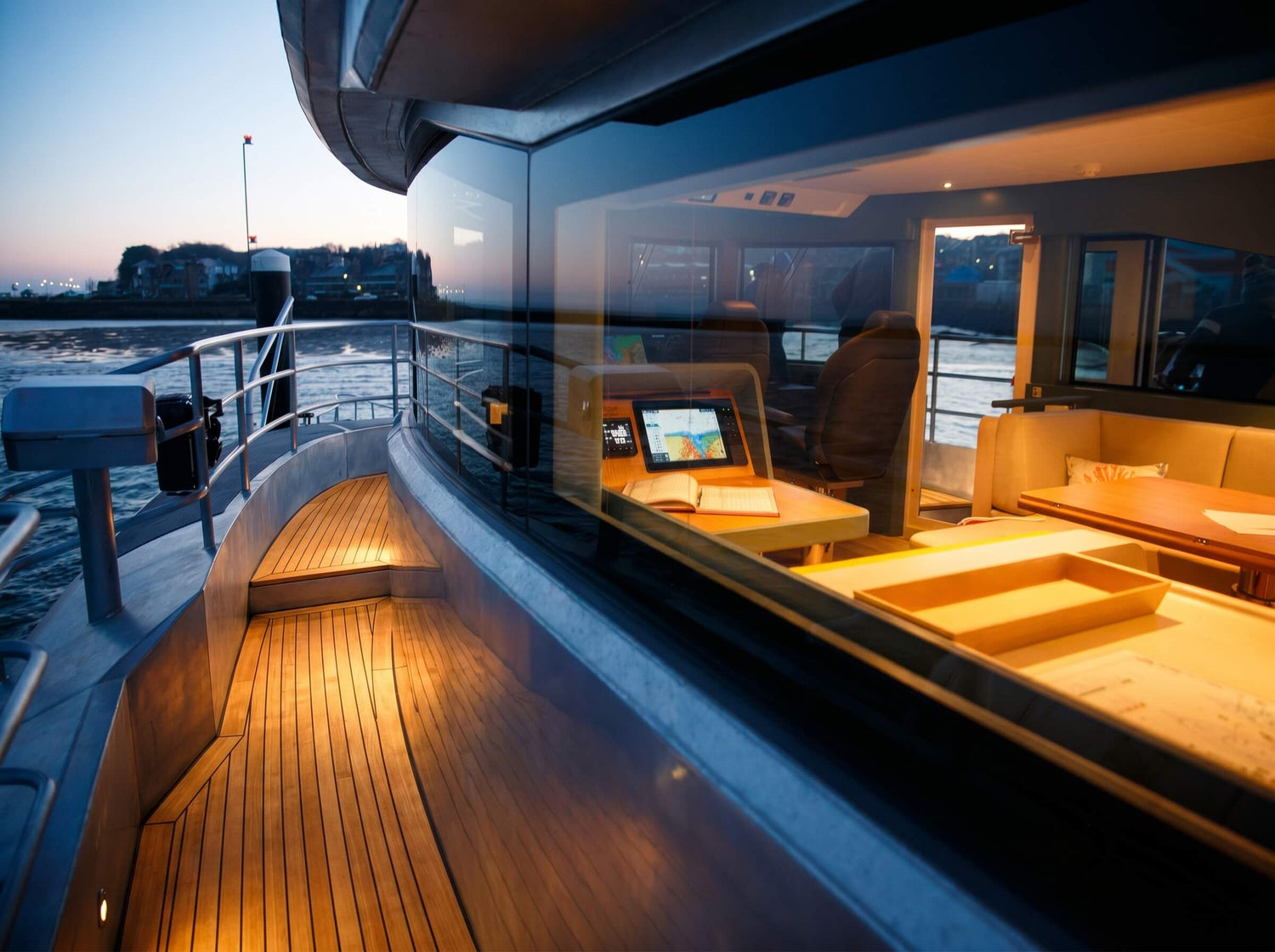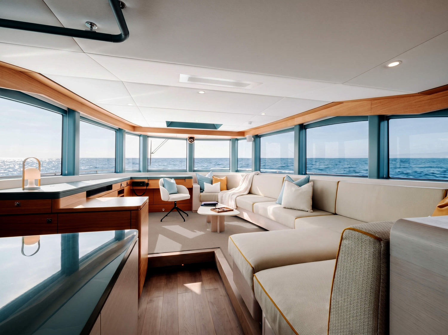 Onboard areas are zoned to provide variation, with flexibility for foredeck and flybridge seating and aft deck dining. Inside, a luxurious interior saloon with wrap-around glazing continues a connection to the outdoors whilst protecting from the elements.