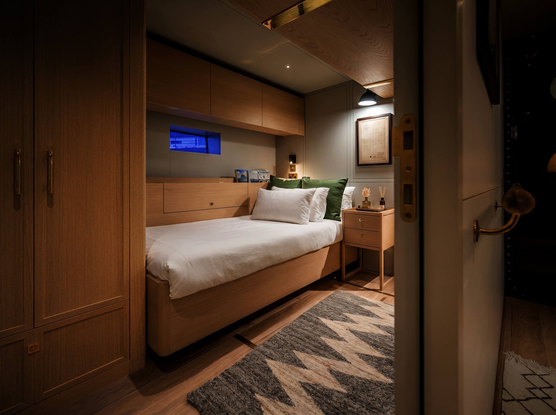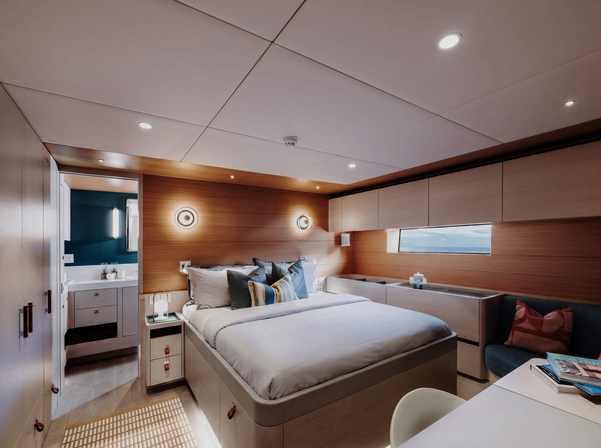 The sanctuary below offers sizeable en-suite cabins and a cosy snug or office room that can be arranged to suit. Natural light fills the area through sizeable portlights, creating a luxurious and relaxing space to rest and unwind.