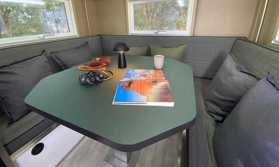 The marine inspired colour & materials in the expedition body create a calm and comfortable interior that can seat 5 and sleep 4 in comfort. It’s packed with ample storage, integrated blinds / fly screens, LED lighting, A/C, TV & infotainment system, a full kitchen with Corian worktops and surfaces that are easy to wipe down.