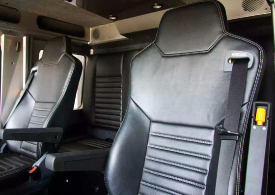 Our extended 6 passenger extra-cab conversion includes a full interior re-trim, sound insulation, ISRI air-ride front seats, power steering, overhead A/C, Polaris infotainment system, and a reversing camera.