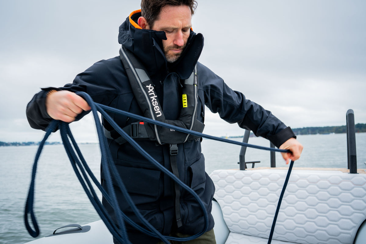 The Arksen Foul Weather Jacket is a robust waterproof jacket made with a 3-layer shell fabric, featuring fully taped seams for maximum protection. It includes Cordura 'Omni Iron' reinforcement at the elbows and seat, making it ideal for sailing, marine activities, and demanding weather conditions.